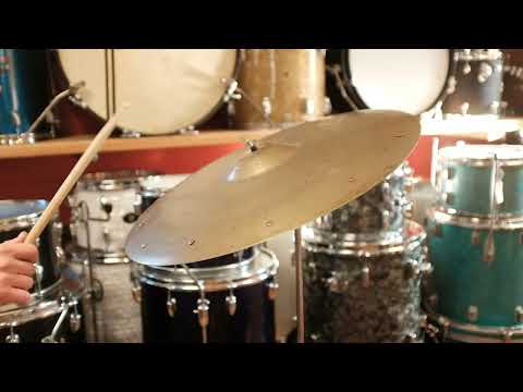 Medium profile with the mid-50s bell cup coming to a somewhat flat top. Complex hammering and consistent lathing. Medium weight with clear, rounded stick definition, and a surprisingly relaxed and billowing crash. Low fundamental note that is sweetened by an even rivet wash.