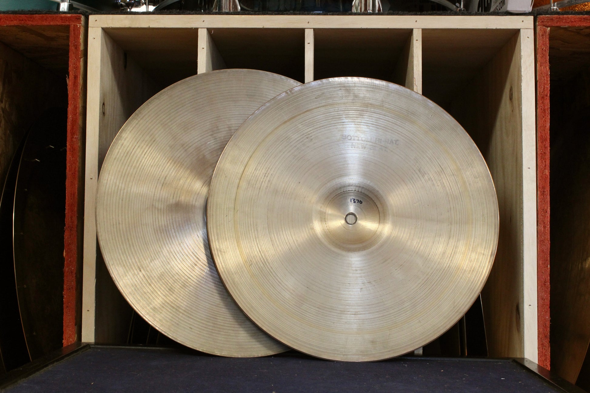 Ink stamps faded but still present. Patina throughout both hats, while still in relatively clean condition. Both cymbals show normal playing wear but are free of any cracks, keyholing or serious blemishes.