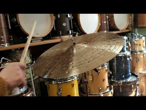Extensive hand-hammering and fully lathed surface. Medium weight, full bodied sound with dark and explosive response that decays quickly. Great as a light ride too.