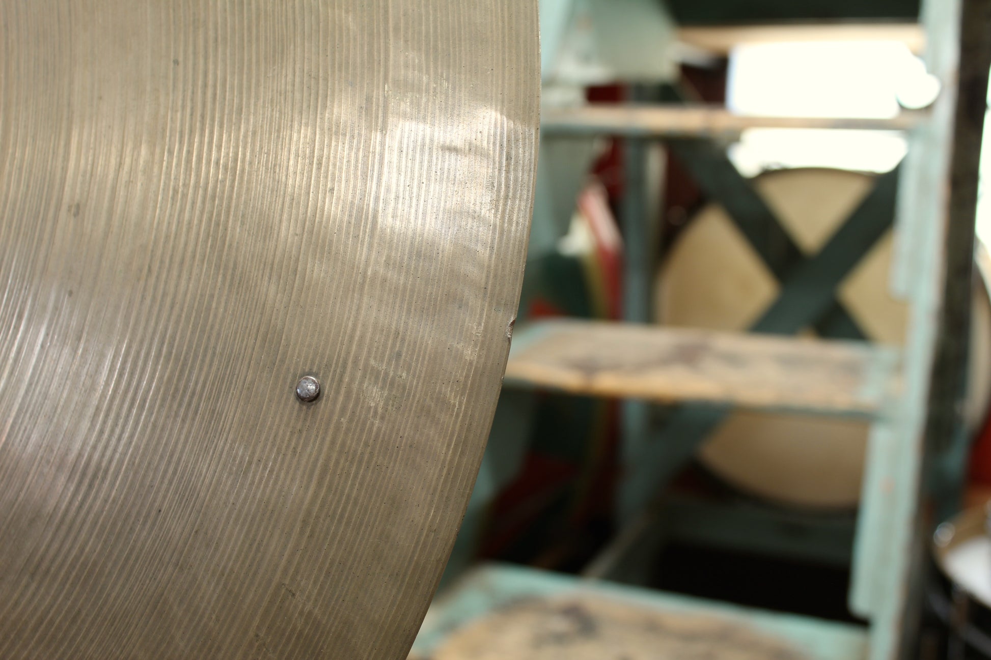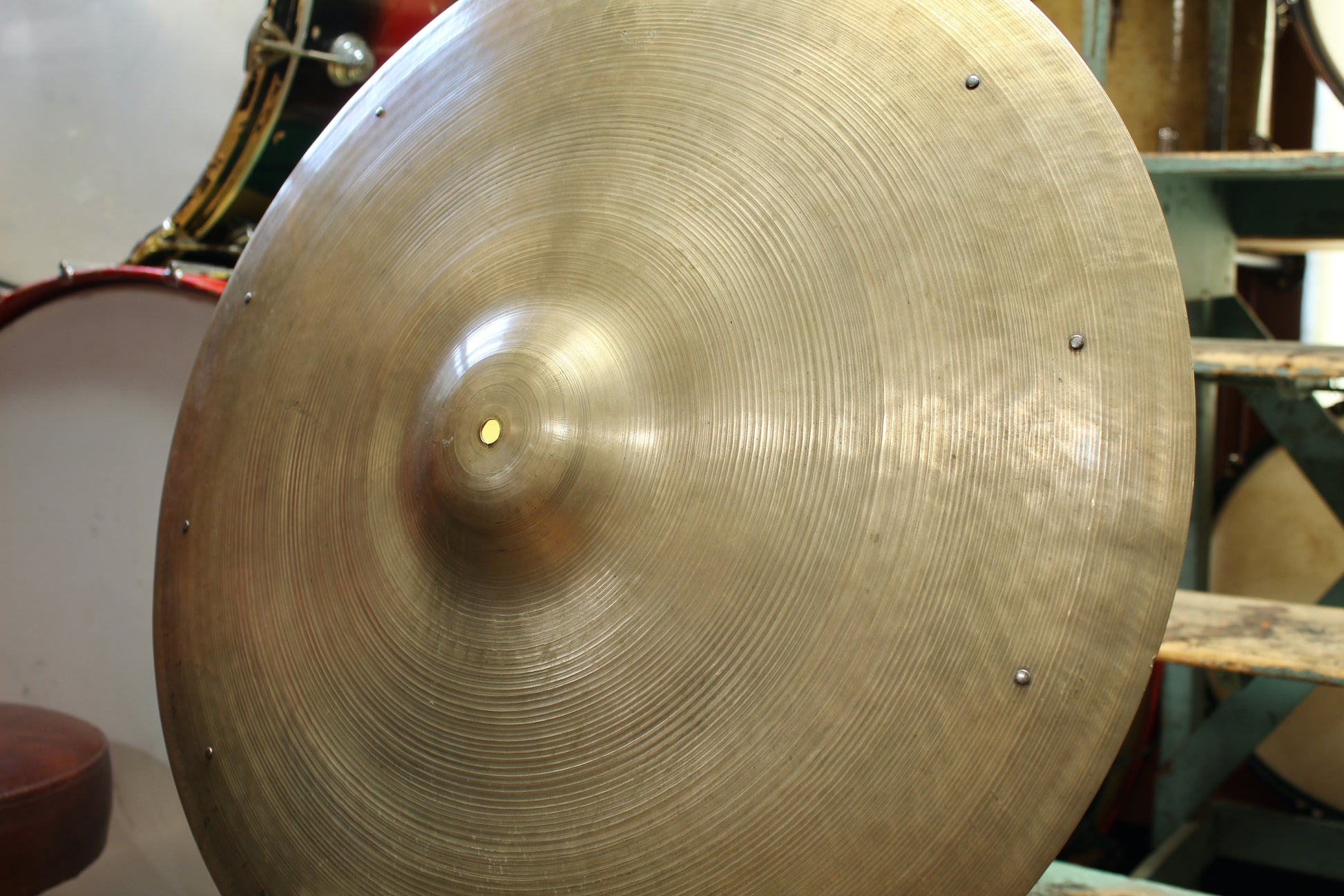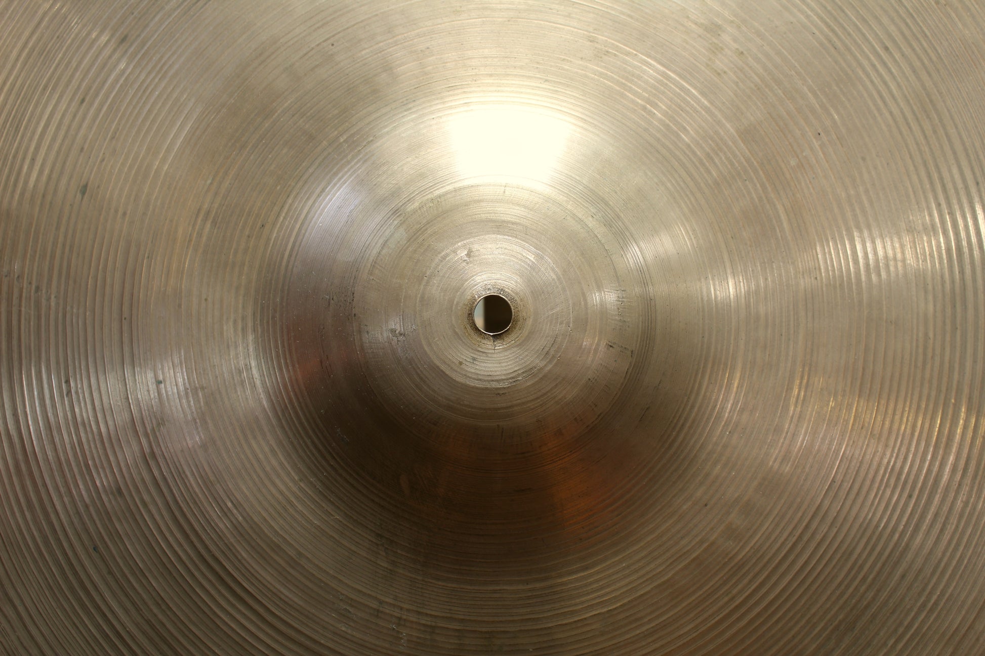 Medium to medium-thin weight but plays like an open, light ride with rivets activating on a touch. Weight tapers towards edge, providing an even balance of stick definition with full, dynamic crashability. Big spread. Dark, smokey overtones. Clean condition with a rich, golden patina throughout.
