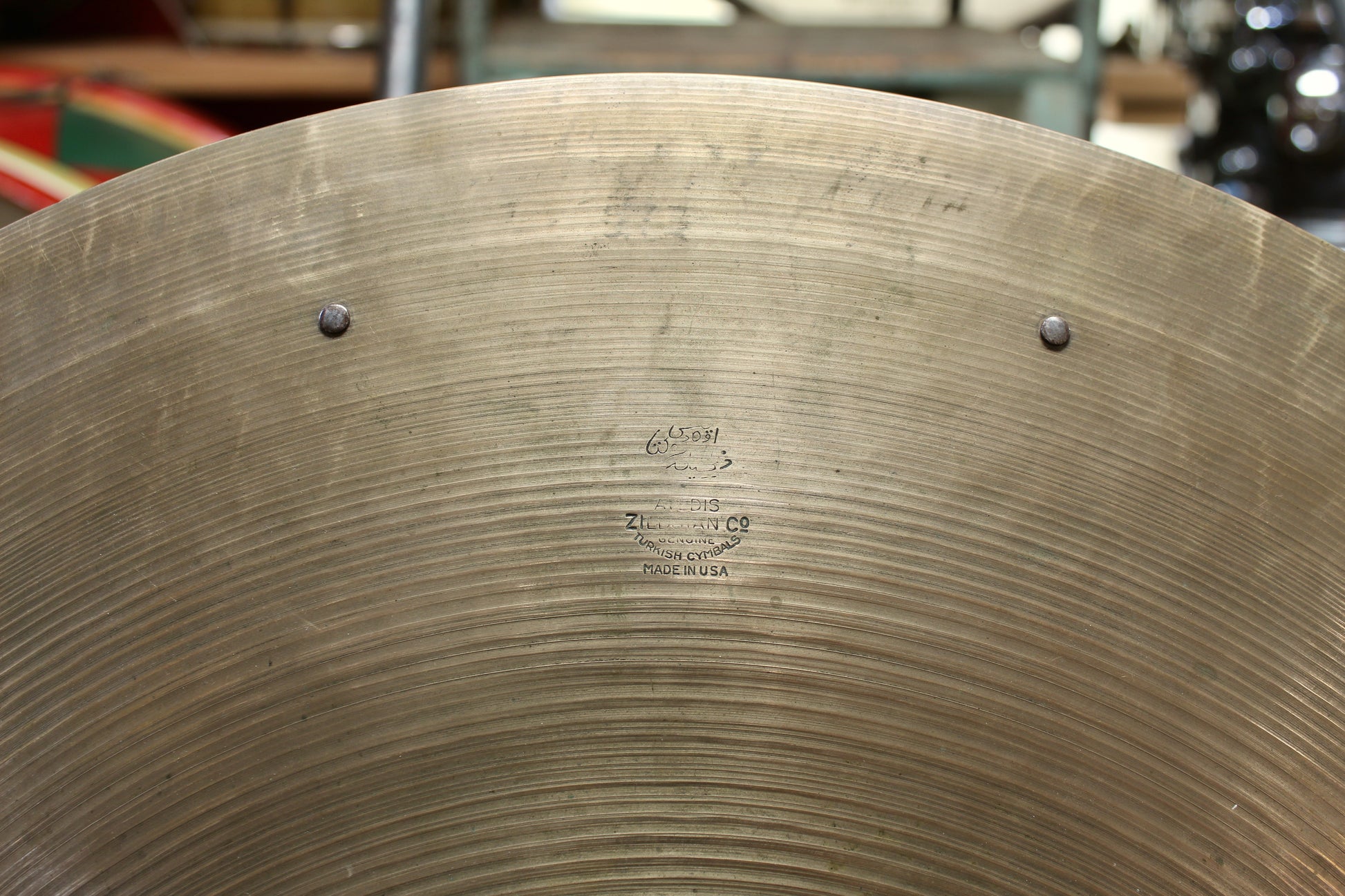 Small 1/4" sized crack in center hole. A few fleabites around and one more prominent nick on edge, included in photos. Previous owner engraved some numbers on bottom of bell. Edges otherwise in good shape, with normal playing wear for its age.